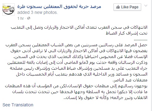 وأضاف المرصد عبر صفحته الرسمية على "فيس بوك" أن الرسالتين تكشفان عن واقعة حدثت يوم 3 مايو الماضي، أدت إلى إصابات بالغة للمعتقلين جراء التعذيب على يد مسلحين وبإشراف ضباط المباحث، ورئيس مصلحة السجون، ومساعد وزير الداخلية الذي هددهم بتعذيب أيام الخمسينات داخل معتقلات عبد الناصر، مناشدين منظمات حقوق الإنسان التدخل لإنقاذهم.