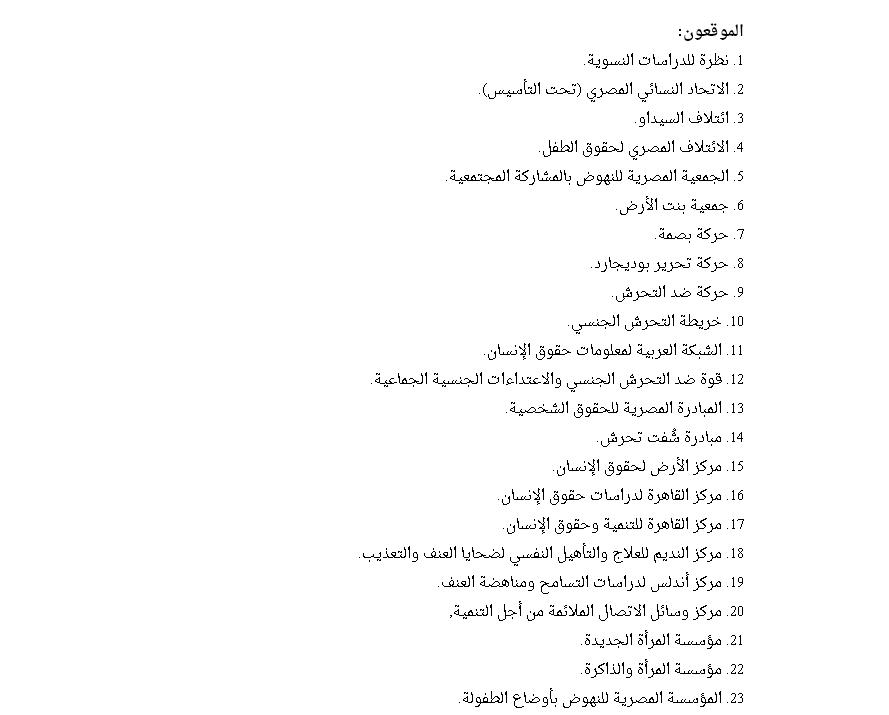 وطالبت المنظمات المعنية بـ"ضرورة أخذ الإجراءات والتدابير اللازمة لحماية النساء اللاتي يقمن بتحرير محاضر خاصة بوقائع التحرش الجنسي التي يتعرضن إليها ومضيهن في الإجراءات القضائية، والتي شهدت قيام أفراد أسرة المتحرشين بالضغط على من يتم التحرش بها لعدم المضي في الإجراءات القانونية المعنية بالرغم من تحريرهن محاضر لعدم التعرض، مما يهدد من أمن وسلامة النساء ويعكس عوار واضح في الإجراءات القانونية الخاصة بتلك الجرائم".