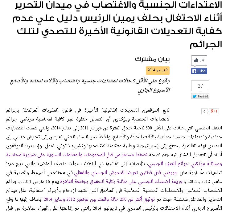 وصدر تقرير حقوقي صدر اليوم عن تلك المنظمات، ذكر أنه "شهدت احتفالات الأمس 8 يونيو 2014 في ميدان التحرير بمناسبة حلف يمين الرئيس الجديد اعتداءات جنسية جماعية واغتصابات جماعية وحشية، حيث تم توثيق 9 حالات، مماثلة للاعتداءات والاغتصابات المُشار إليها بالآلات الحادة والأصابع، والتي يسفر عنها عادة إصابات جسدية بالغة للناجيات. والجدير بالذكر أن الدولة استمرت في عدم قدرتها على التصدي لتلك الجرائم نتيجة لغياب منظومة استراتيجية كاملة".