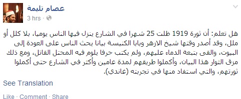 وأضاف تليمة فى تدوينة عبر صفحته على فيس بوك:" أصدر وقتها شيخ الأزهر وبابا الكنيسة بيانا يحث الناس على العودة إلى البيوت، والقى بتبعة الدماء عليهم، ولم يكتب حرفا يلوم فيه المحتل القاتل، ومع ذلك مزق الثوار هذا البيان، وأكملوا طريقهم لمدة عامين وأكثر في الشارع حتى أكملوا ثورتهم، والتي استفاد منها في تجربته (غاندي)".