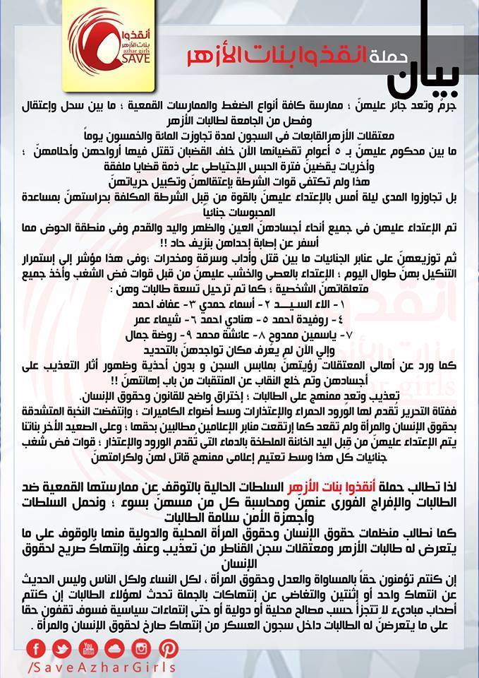 وقال البيان أنه حدث ممارسات قمعية بكافة أنواع الضغط والجرمٌ وصفت بالتعدي الجائر عليهنّ ؛ما بين سحل واعتقال وفصل من الجامعة لطالبات الأزهر