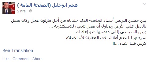 وقال أبو خليل فى تدوينة عبر صفحته على موضع التواصل الاجتماعي "فيس بوك": "بين حسن البرنس أستاذ الجامعة الذي جلدناه من أجل مارثون عجل وكان يعمل بالفعل علي الأرض ويحاول أن يفعل شيء للإسكندرية، وبين السيسي اللي مقضيها شو إعلانات، سيظهر لنا عدم أماناتنا في المقارنة ﻷن الإعلام كرس فينا الغباء !!".