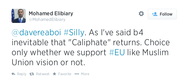 وقال "الإبياري" في تغريدة أثارت الجدل في أمريكا على حسابه الرسمي في "تويتر": "كما قلت من قبل إن عودة الخلافة أمر حتمي.. والخيار الوحيد لنا أن ندعم رؤية تجعلها مثل الإتحاد الأوروبي" .