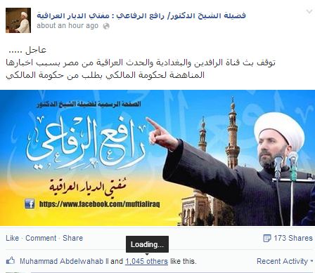 وقال المفتي رافع الرفاعي عبر صفحته الرسمية على فيس بوك:"توقف بث قناة الرافدين والبغدادية والحدث العراقية من مصر بسبب أخبارها المناهضة لحكومة المالكي بطلب من حكومة المالكي".