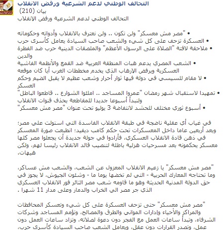 وتابع البيان:"مصر مش معسكر" يا زعيم الانقلاب المعزول عن الشعب، ولن تكون، ولن نعترف بالانقلاب وأدواته وحكوماته. عودوا إلي معسكراتكم يا أبناء الفريق عبد المنعم رياض وسعد الدين الشاذلي وغيرهم من قادة مصر العظام، وعسكرونها كما تشاءون انتظارا لما هو آت في منطقة تعيش فوق صفيح ساخن، واعلموا أن الجندية ليست ضرب المواطنين بالرصاص في الشوارع ولا يليق بها الصمت على استباحة الطلاب – مستقبل الوطن – والحرائر – شرف الأمة – في المعتقلات، كما لا يليق بها إعدام علماء الأمة والمظلومين، ولا إجبار المواطنين علي ركوب الدراجات في وطن بلا أساسيات، ولا يجوز إخلاء حارات من الشوارع المزدحمة لزوم هذه الدراجات التي تصدرت برنامج اللا برنامج لقائد الانقلاب، ولا يليق بها قتل البسطاء في أقسام الشرطة وعلى قارعة الطريق بالمسدسات الميري .