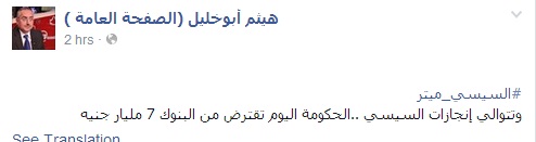 وقال أبو خليل في تدوينة عبر صفحته الشخصية على موقع التواصل الاجتماعي "فيس بوك": "وتتوالي إنجازات السيسي ..الحكومة اليوم تقترض من البنوك 7 مليار جنيه".