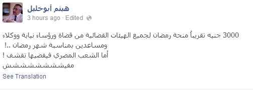 وقال أبو خليل فى تدوينة عبر صفحته على "فيس بوك":"3000 جنيه تقريباُ منحة رمضان لجميع الهيئات القضائية من قضاة ورؤساء نيابة ووكلاء ومساعدين بمناسبة شهر رمضان ..! ، أما الشعب المصري فيقضيها تقشف !".