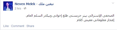 وقالت ملك في تدوينة عبر صفحتها على موقع التواصل الاجتماعي "فيس بوك": الصحفي الاسترالي بيتر جريستي طلع إخواني وبيكدر السلم العام، إعجاز معلوماتي مفيش كلام".