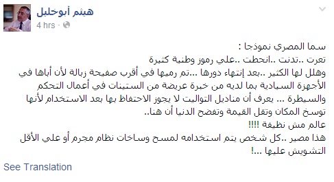 وأضاف أبو خليل ،سما المصري نموذجا : تعرت ..تدنت ..انحطت ..علي رموز وطنية كثيرة وهلل لها الكثير ..بعد إنتهاء دورها …تم رميها في أقرب صفيحة زبالة لأن أباها في الأجهزة السيادية بما لديه من خبرة عريضة من الستينات في أعمال التحكم والسيطرة … يعرف أن مناديل التواليت لا يجوز الاحتفاظ بها بعد الاستخدام لأنها توسخ المكان وتقل القيمة وتفضح الدنيا أن هنا.. عالم مش نظيفة !!!!